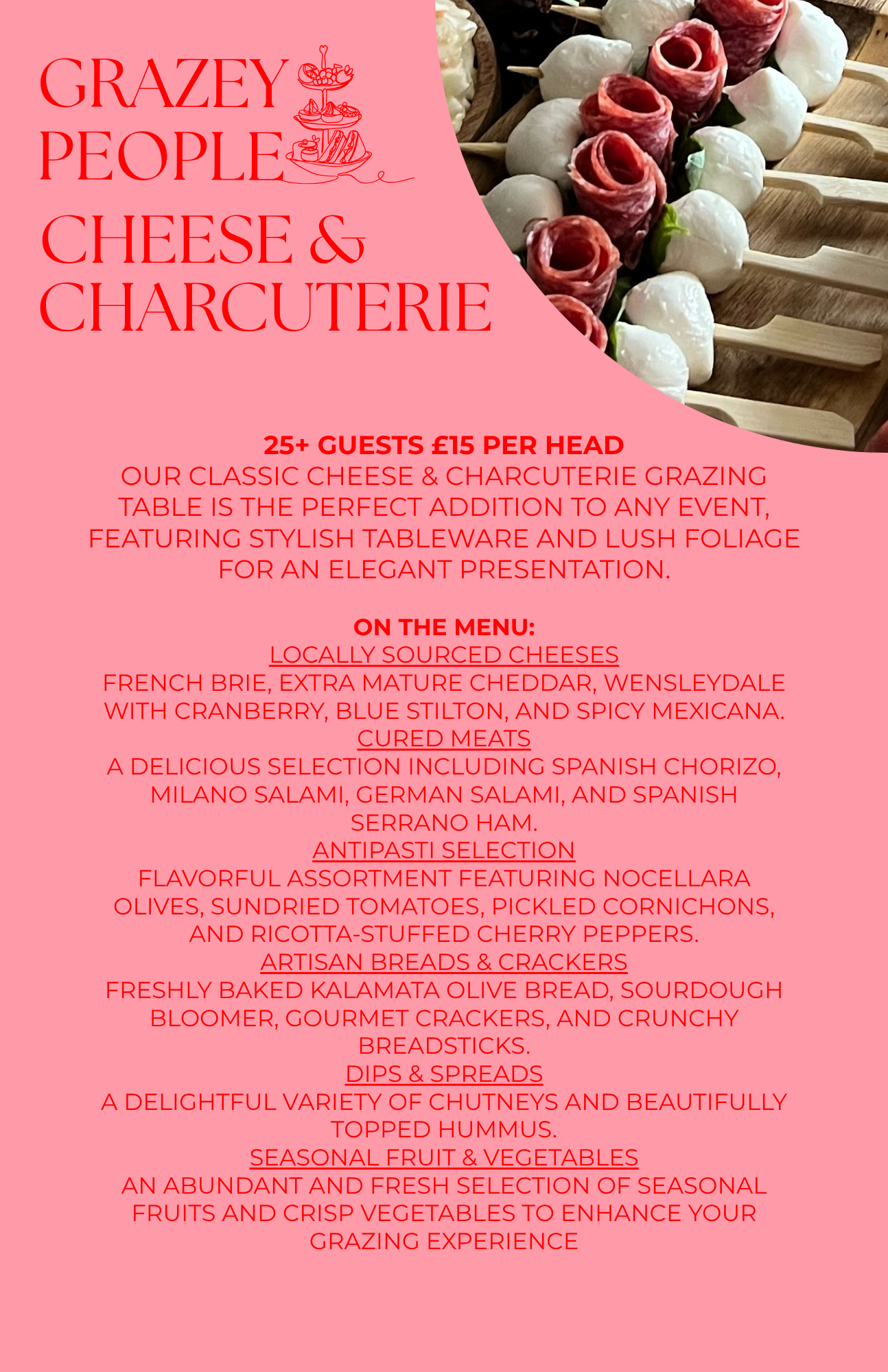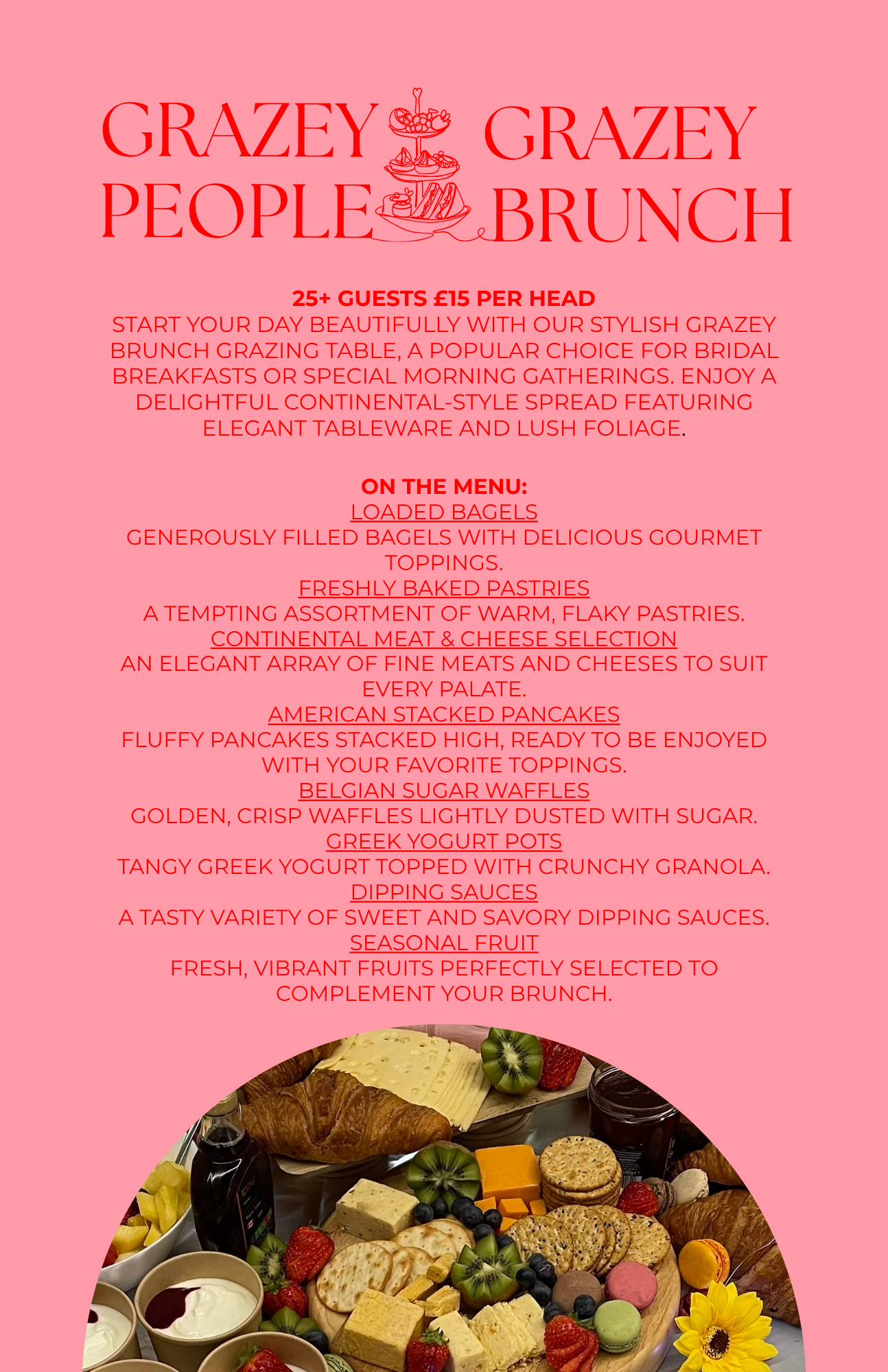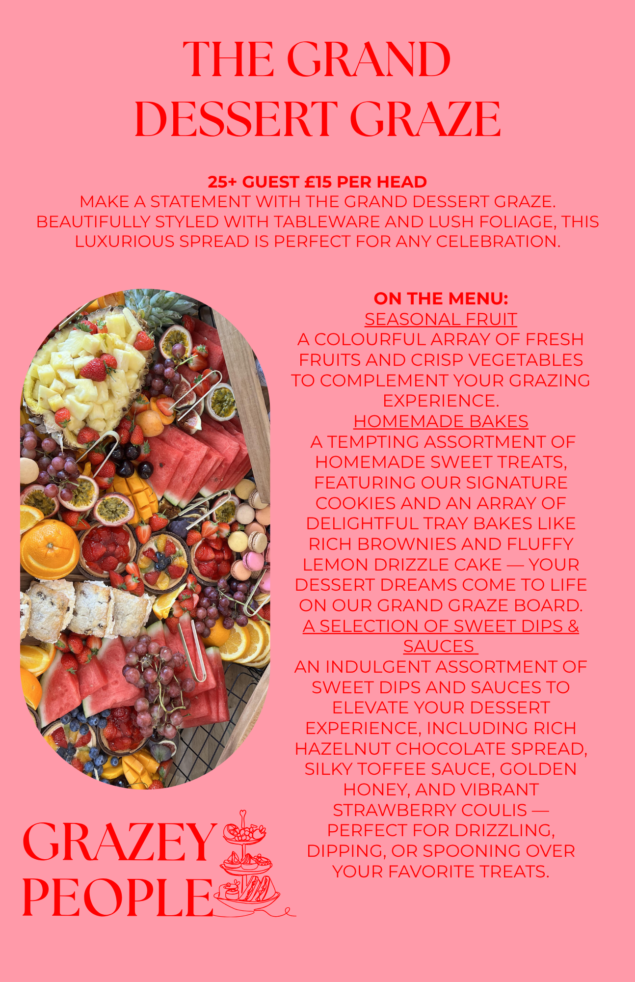 OUR SERVICES The Grand Graze £18pp 25+ guests The Grand Dessert Graze £15pp 25+ Guests. Cheese & Charcuterie£15pp 25+ Guests. Grazey Brunch £15pp 25+ Guests
